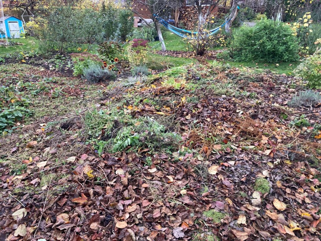 Mulčiavimas aktualus ir rudenį – dirvos žiemai jokiu būdu negalima palikti „nuogos“. Ją būtina apdengti – ir kuo storiau, tuo geriau. Praeitą rudenį į daržą suverčiau viską, ką rudenį nuroviau, nupjoviau, sugrėbiau ir nukirpau – net aviečių stiebus. Iki pavasario viskas supuvo, ir pavasarį turėjau praturtintą, pailsėjusią, pamiegojusią dirvą. Į daržą neverčiau tik pomidorų stiebų iš šiltnamio ir rožių lapų bei stiebų.